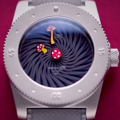 The dial of the Trippy is no mere backdrop. By layering patterns, we created a true Moiré effect, a subtle optical dance that changes every second, every minute and every hour. The texture is never static. Your watch dial comes alive, turning into a kinetic graphic that brings a smile even while you are timing a dive or a project with the Mushroom hands.